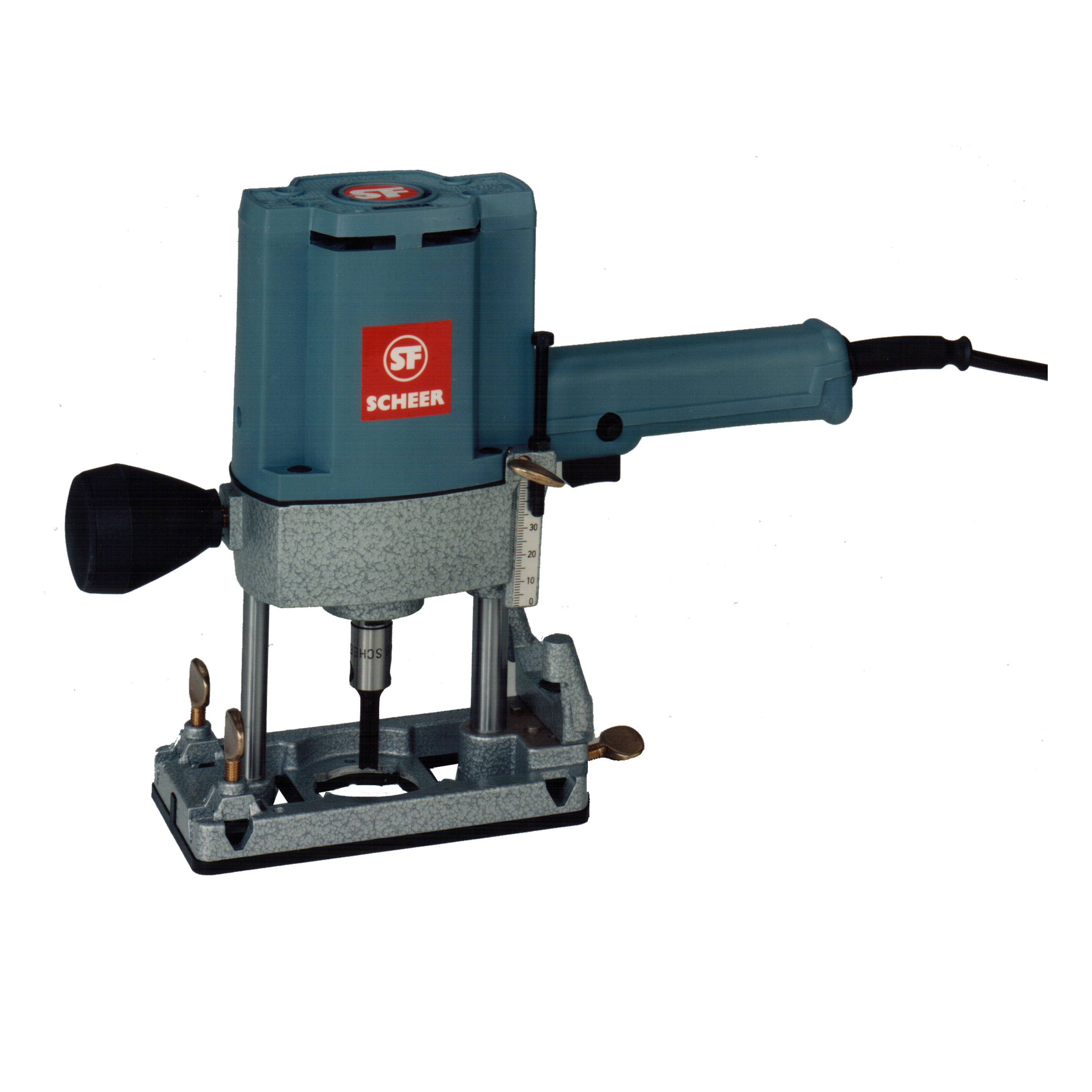Durch die schmale Bauform kann weit in die Innenecke gefräst werden. Als Einhand-Oberfräse ausgelegt, mit Universalmotor für Wechselstrom.